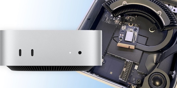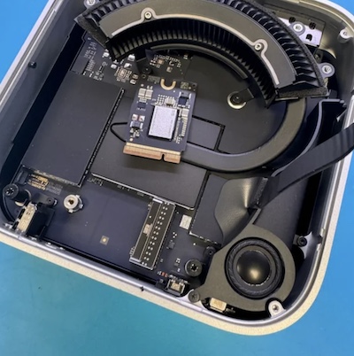 그런데 맥 미니 M4는 맥 규격의 SSD가 있다면 교체 가능한 구조로 되어 있습니다. 슬롯에서 떼서 다른 메모리를 넣어주면 되는 구조입니다. 맥미니 하단을 뜯어내면 Mac용 SSD가 들어 있는 것을 볼 수 있습니다. 이 슬롯의 SSD를 원하는 용량으로 교체해 주면 간단하게 교체할 수 있습니다.